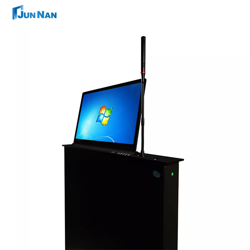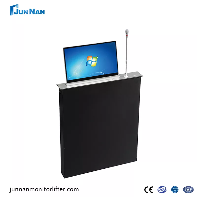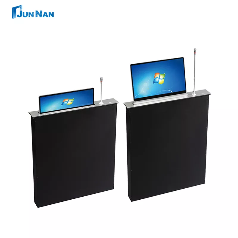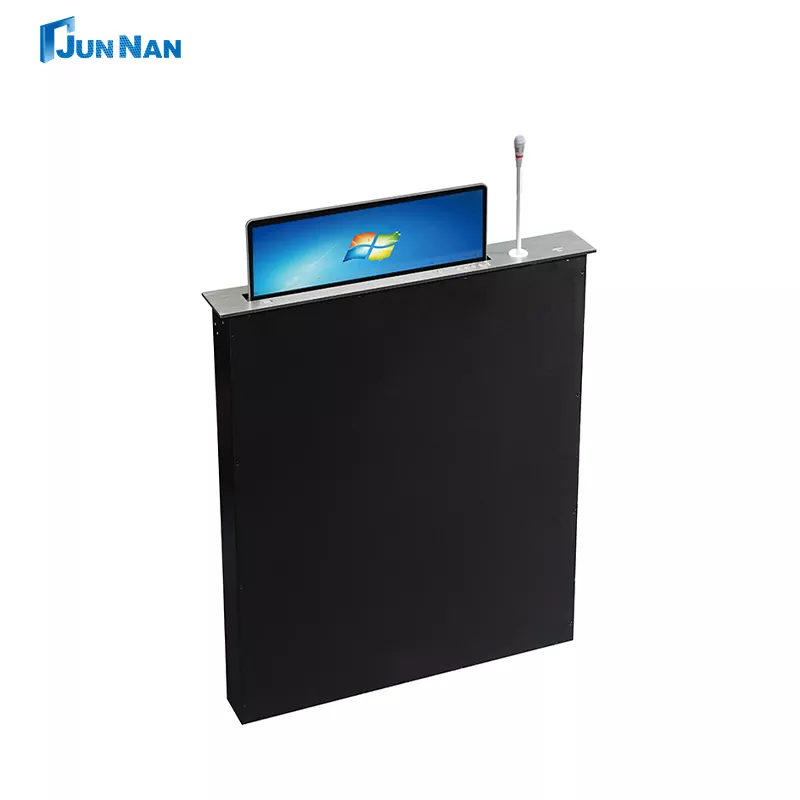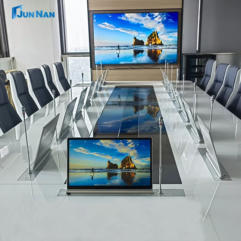 Avansert skrivebordsløft ultratynt display papirløst konferansesystem elektrisk heis er egnet for alle slags scenarier, vi har CNC maskinskjæringsteknologi og laserteknologi, det nyeste konferansebordet Desktop Lifting Display-teknologi sikrer at produktet er super høy standard. Utstyret kan effektivt spare plass og gjøre skrivebordet mer ryddig. Samtidig kan dens høydejusterbare funksjon møte behovene til forskjellige brukere og forbedre arbeidskomforten. Løfteren består hovedsakelig av tre deler: display, brakett og kontrollboks. Displayet ruller opp og ned for å realisere justeringen av skjermen, en liten boks er plassert på braketten for å fikse skjermen, og kontrollboksen er satt opp med komponenter som LCD og sensorer. Alle våre Desktop Lifting Display er laget i Kina, tilgjengelig for engroskjøp, kan tilpasses privat for kunder, og har nok Desktop Lifting Display på lager for å støtte rask levering til kunder. Og vi, Junnan Equipment, har en rekke sertifikater og sertifiseringer som CCC, CE-sertifisering, ROHS, ISO-sertifisering osv. Våre produkter er trygge og av høy kvalitet med eksportkvalifisering, og vi er fabrikkdirekte med gunstig pris, og vi har vår egen fabrikk, som har vært i drift i mange år.